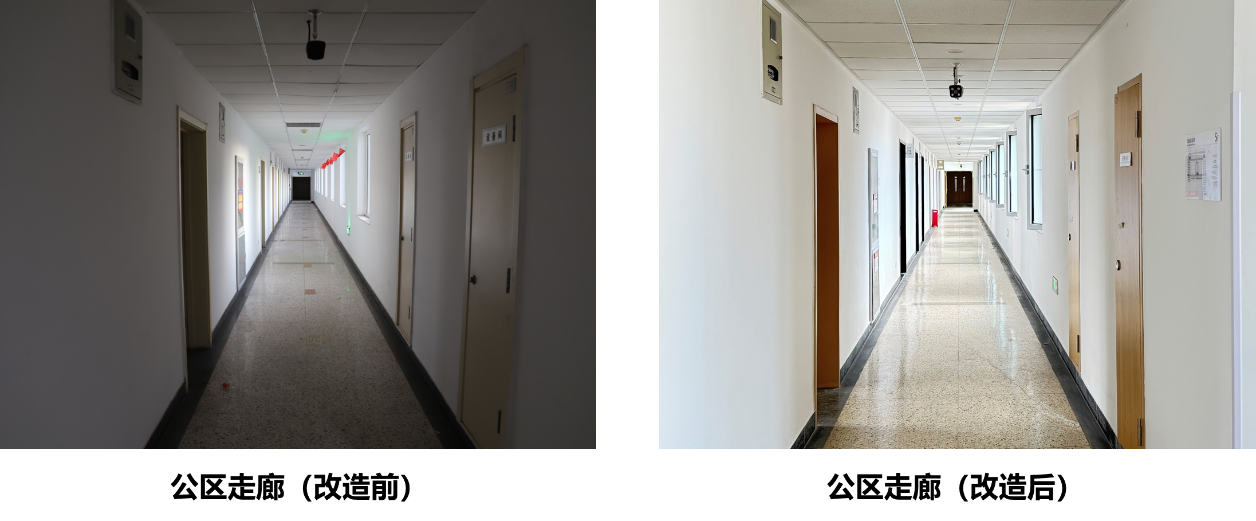 改造重点从六个方面改善住宿条件,一是浴室升级改造,从地下室大浴室集中洗浴优化为每层就近设置浴室供学生洗浴,增加总喷淋头数量。二是盥洗室、卫生间翻新,配套设备设施全部新做,盥洗室实现热水供应;卫生间实现低层高压供水,解决卫生间水压不足问题。三是宿舍住宿环境优化,入户木门更换为钢制门并配备电子门锁,消除安全隐患,使用更加便利;塑钢窗更换为充氩气断桥铝窗,优化外窗节能效果。四是公区及活动空间改造,精装修活动空间并配置舒适家具,满足学生休闲、学习需求。五是屋面防水及保温层整体翻新重做,根治屋面漏水问题。六是对外立面、楼内墙面、地面、顶面整体翻新等,使整个公寓楼更加干净、明亮、舒适,焕然一新。